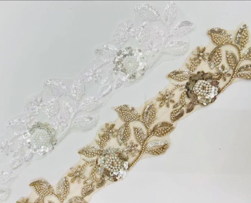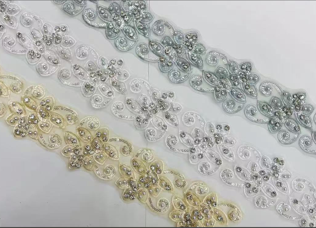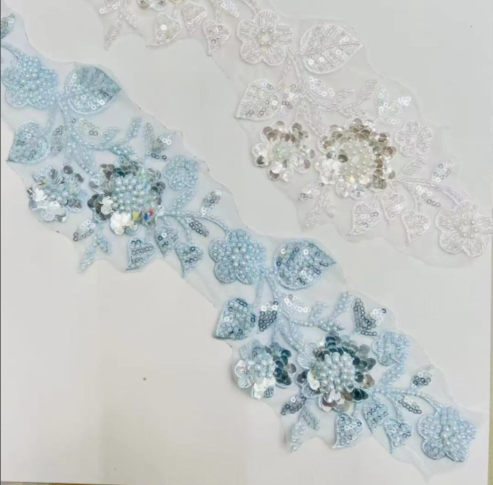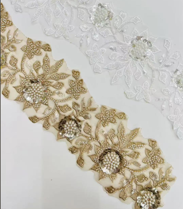 Nový príchod dekoratívne odevy Šitie Krásne spletené spletené korálkové čipky Perl Lace, ktoré prijíma kombinovaný dizajn trojrozmerného tkania lana, lesklé flitre a lesklé korálky, ktoré majú bohaté vrstvy a jemný dotyk. Je vhodný pre špičkové dekorácie, ako sú večerné šaty Haute Couture, svadobné šaty, večerné tašky a pokrývky hlavy, ktoré ľahko vylepšujú veľkoleposť jednotlivých predmetov.